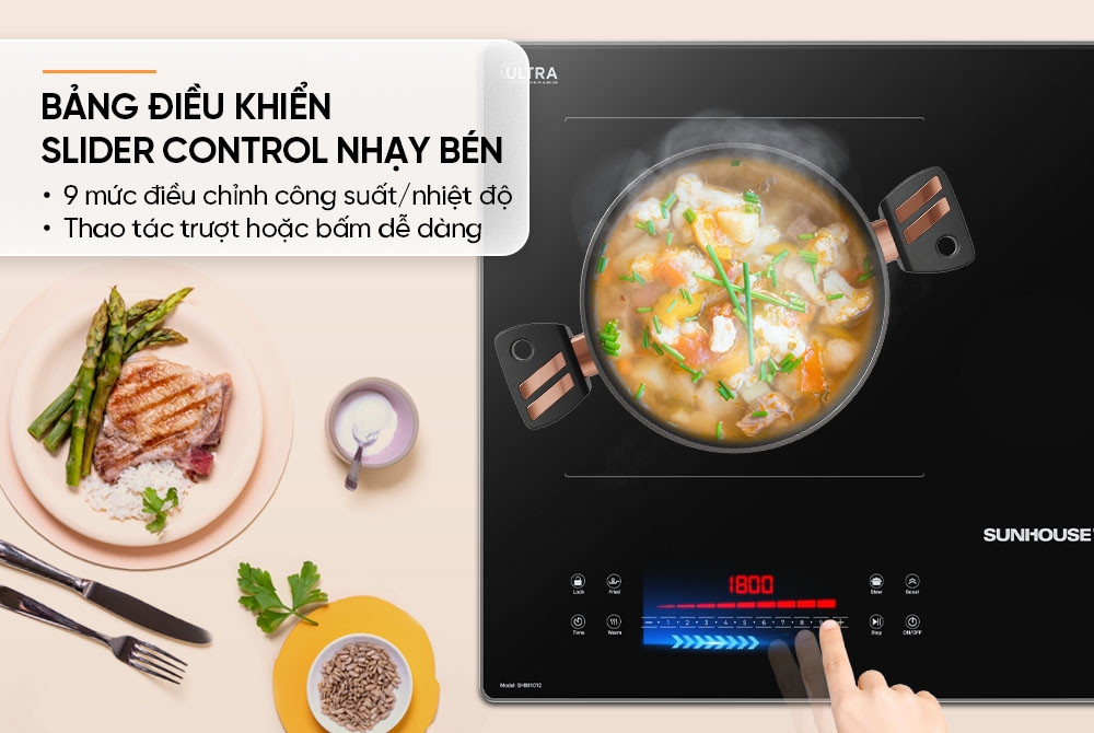Bếp có 9 mức điều chỉnh nhiệt độ/công suất với 2 bảng điều khiển riêng biệt cho từng vùng nấu. Mặt điều khiển SLIDER CONTROL cảm ứng nhạy bén giúp điều chỉnh nhiệt độ và các chế độ nấu nhanh chóng và thuận tiện chỉ với 1 thao tác. Người dùng thực hiện thao tác trượt tay sang trái hoặc sang phải để tăng/giảm và điều chỉnh nhiệt độ, công suất hoặc thời gian. Điều khiển cảm ứng trượt dễ dàng sử dụng, phù hợp với mọi đối tượng.