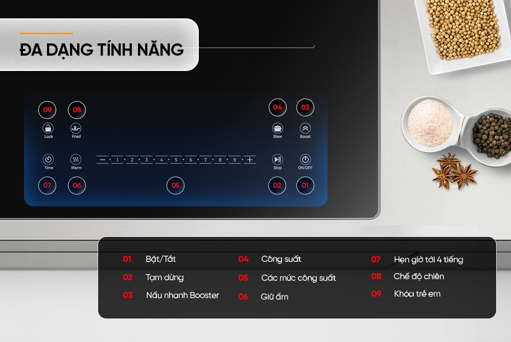 Chức năng nấu nhanh – BOOSTER giúp bếp đẩy lên mức công suất cực đại nhanh nhất, giúp gia nhiệt nhanh chóng và cho hiệu suất hoạt động lên đến 90% so với các bếp từ thông thường. Chức năng Booster cho phép tăng công suất lên mức cao nhất trong thời gian ngắn, giúp nhiệt độ tăng nhanh chóng và nấu nướng được thực hiện một cách hiệu quả. Điều này giúp tiết kiệm thời gian và làm việc nhanh hơn trong bếp.