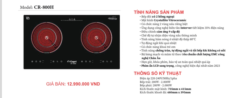 ⇒ Bếp Hồng Ngoại Capri luôn đem đến tính năng đáp ứng mọi nhu cầu sử dụng trong gia đình. Dòng bếp điện cao cấp, độ bền tốt, từng chi tiết cấu tạo đều thích hợp với gia đình Việt Nam.