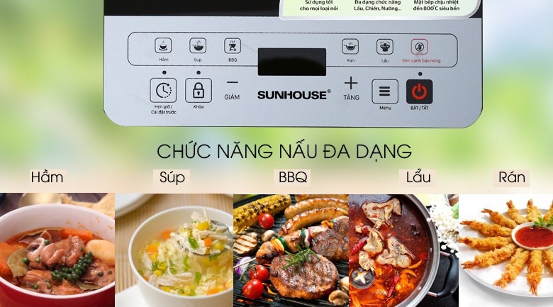 Bếp hồng ngoại Sunhouse SHD 6005 có các chế độ nấu là nấu lẩu, nấu súp, nướng, chiên/xào, hầm, bạn có thể thỏa thích chế biến nhiều món ăn ngon mà không cần có kinh nghiệm nấu ăn phong phú.