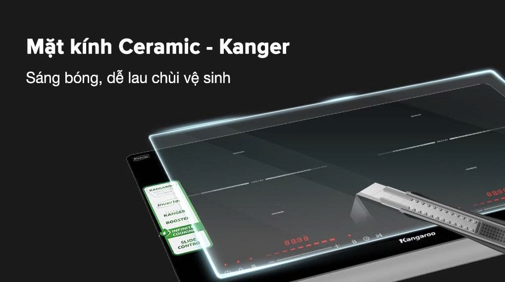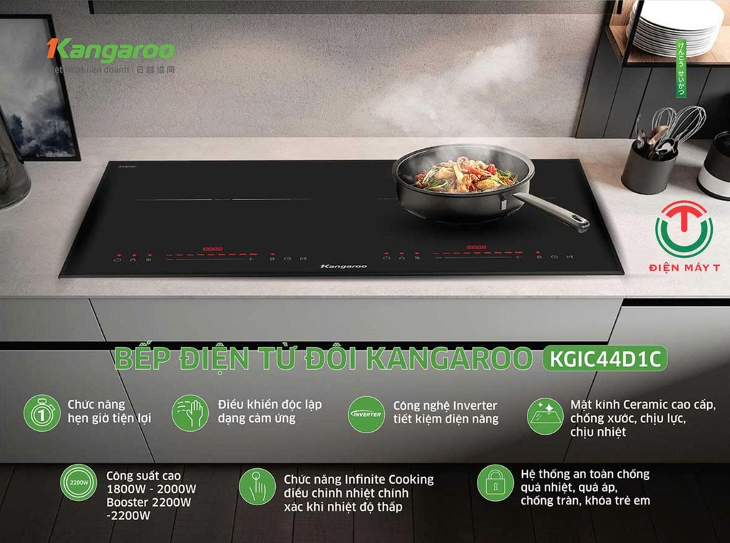 Bếp điện từ đôi Kangaroo KGIC44D1C có công suất cao, thiết kế mặt kính Ceramic Kanger cao cấp, chức năng Infinite Cooking – đun liu riu giúp nhiệt lượng tỏa đều. Ngoài ra, bếp từ Kangaroo được tích hợp các tính năng hiện đại như Inverter tiết kiệm điện, Booster gia nhiệt nhanh, công nghệ chống quá nhiệt, quá áp, chống tràn.