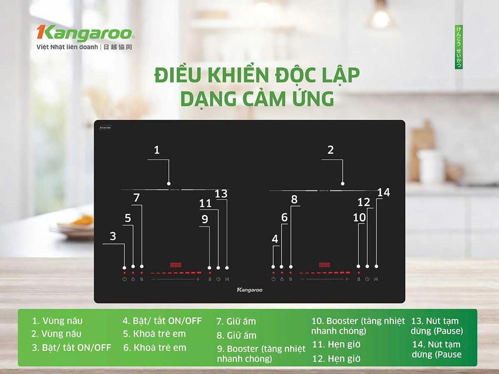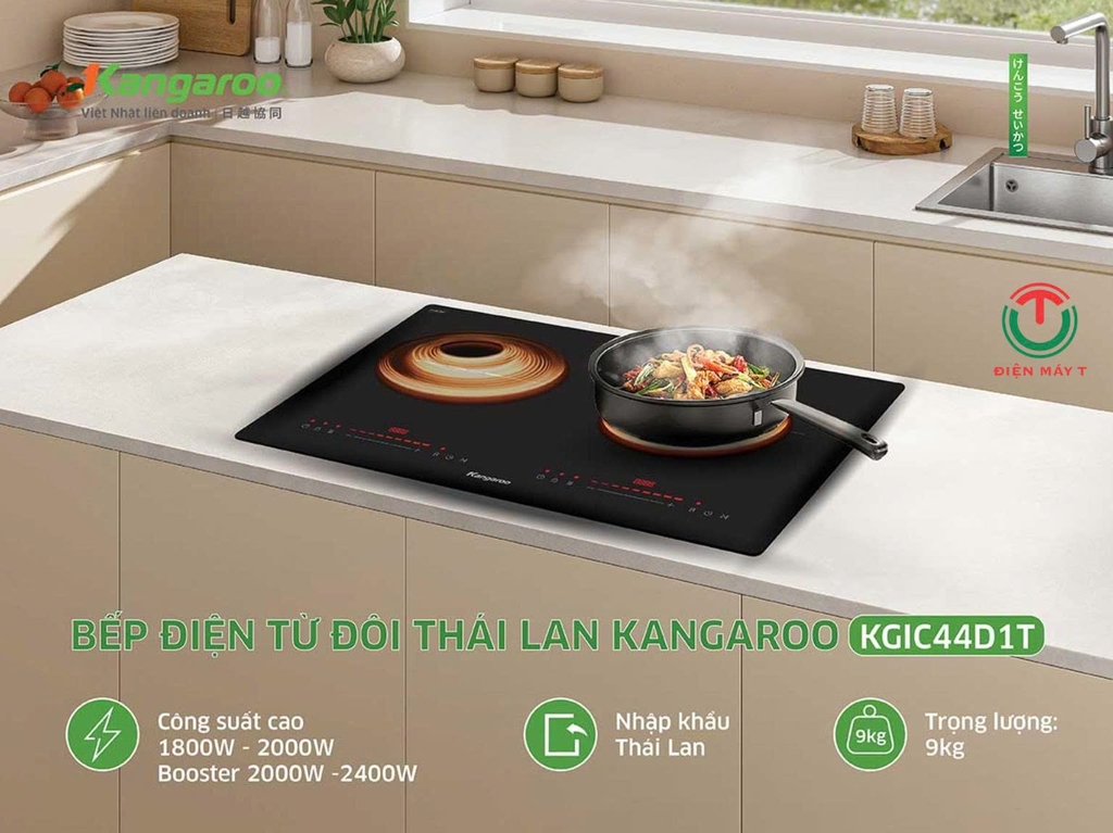 Bếp điện từ đôi Thái Lan Kangaroo KGIC44D1T có công suất cao, thiết kế mặt kính Ceramic Kanger cao cấp, chức năng Infinite Cooking – đun liu riu giúp nhiệt lượng tỏa đều. Ngoài ra, bếp từ Kangaroo được tích hợp các tính năng hiện đại như Inverter tiết kiệm điện, Booster gia nhiệt nhanh, công nghệ chống quá nhiệt, quá áp, chống tràn.
