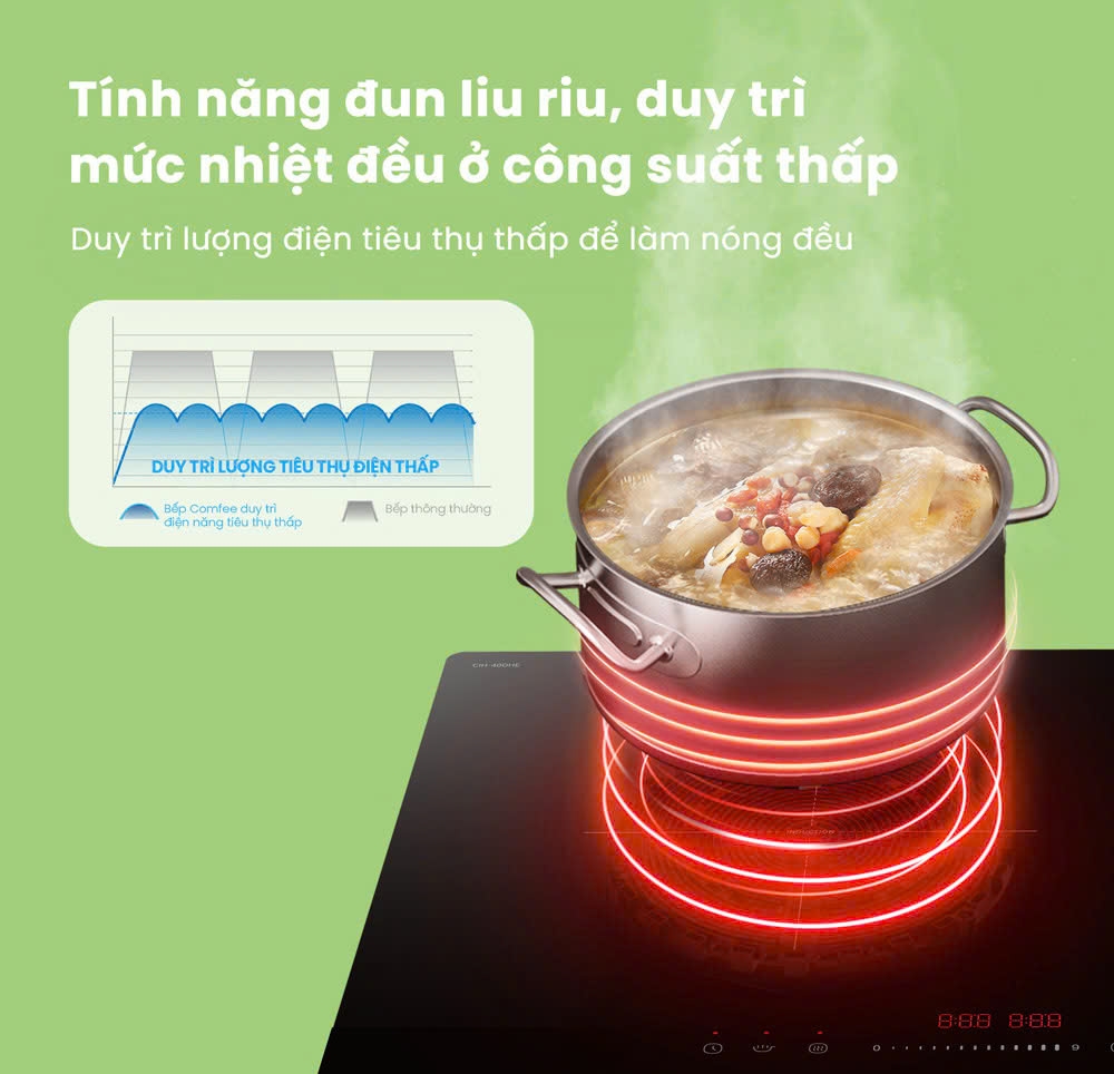 Khi nấu ở mức công suất thấp, bếp từ Comfee CIH-40DHE giúp duy trì nhiệt độ ổn định, làm cho các món hầm và kho trở nên mềm mịn, thấm gia vị và đậm đà hơn.