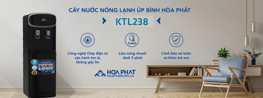 - Cây nước nóng lạnh Hòa Phát HTL238 là dòng sản phẩm trang bị công nghệ úp bình tiện lợi cùng mức giá không quá cao, giúp người sử dụng có thể thay thế dễ dàng, thích hợp cho gia đình, văn phòng, bệnh viện... Được xem như phiên bản màu đen của HTL236, sản phẩm HTL238 với chất liệu vỏ máy bằng nhựa ABS siêu bền màu đen nguyên khối sang trọng cùng khung thép bền bỉ, sản phẩm đem lại sự sang trọng và thích hợp với mọi không gian trong ngôi nhà bạn.