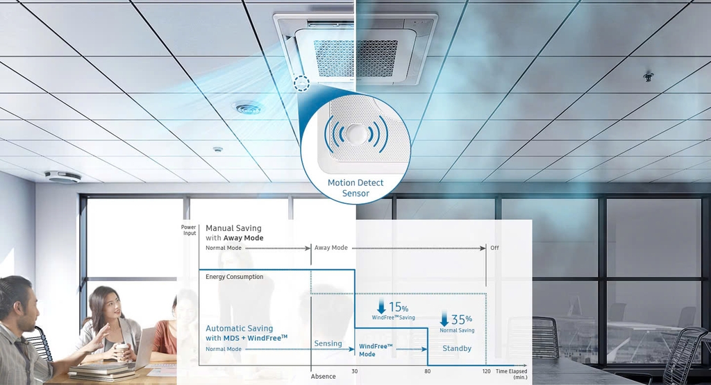 Cảm Biến Chuyển Động* sẽ nhận biết chuyển động trong phòng để biết phòng có người hay không. Khi phòng trống, tính năng này tự động chuyển sang chế độ WindFree™ rồi sang chế độ chờ giúp giảm tiêu thụ năng lượng tới 50%** ở những nơi ít sử dụng như phòng hội nghị.