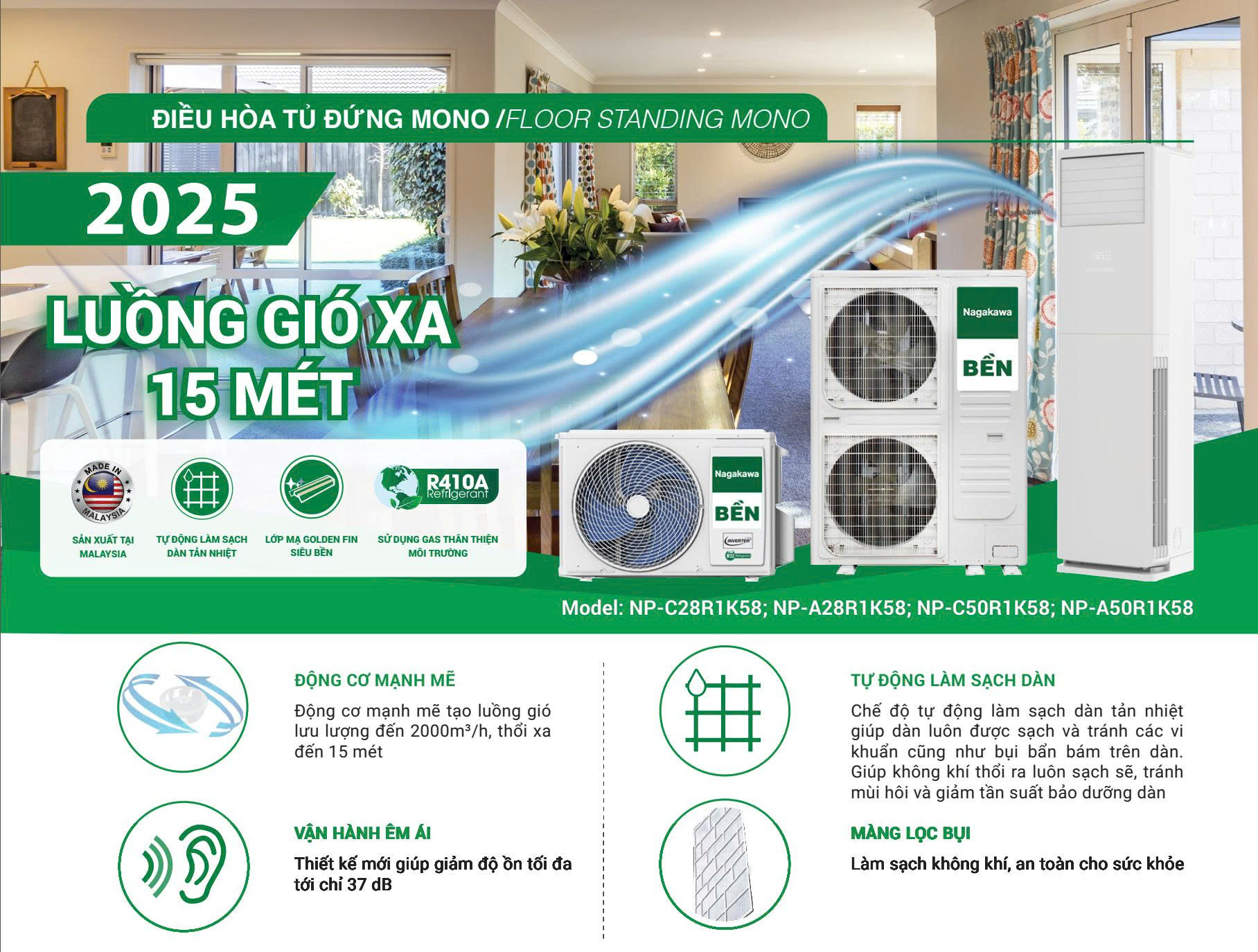 Nagakawa NP-C50R1K58 là dòng điều hòa tủ đứng được thiết kế dành riêng cho môi trường thương mại: lưu lượng gió mạnh, làm mát nhanh, vận hành ổn định và tối ưu không gian lắp đặt – tất cả trong một lựa chọn hiệu quả và lâu dài cho chủ cơ sở.