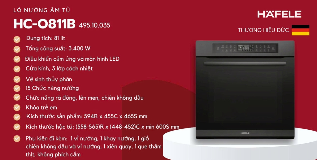 Lò nướng Hafele HC-O811B (495.10.035) thiết kế âm tủ gọn gàng, sang trọng, dung tích lớn 81 lít thoải mái sử dụng cho gia đình. Sản phẩm được trang bị 15 chức năng nướng đa dạng, bao gồm cả chiên không dầu tiện lợi. Cửa kính 3 lớp an toàn, đóng mở giảm chấn êm ái. Khoang lò dễ dàng vệ sinh nhờ chức năng tự vệ sinh thuỷ phân, đem đến sự tiện dụng tối đa cho người dùng.