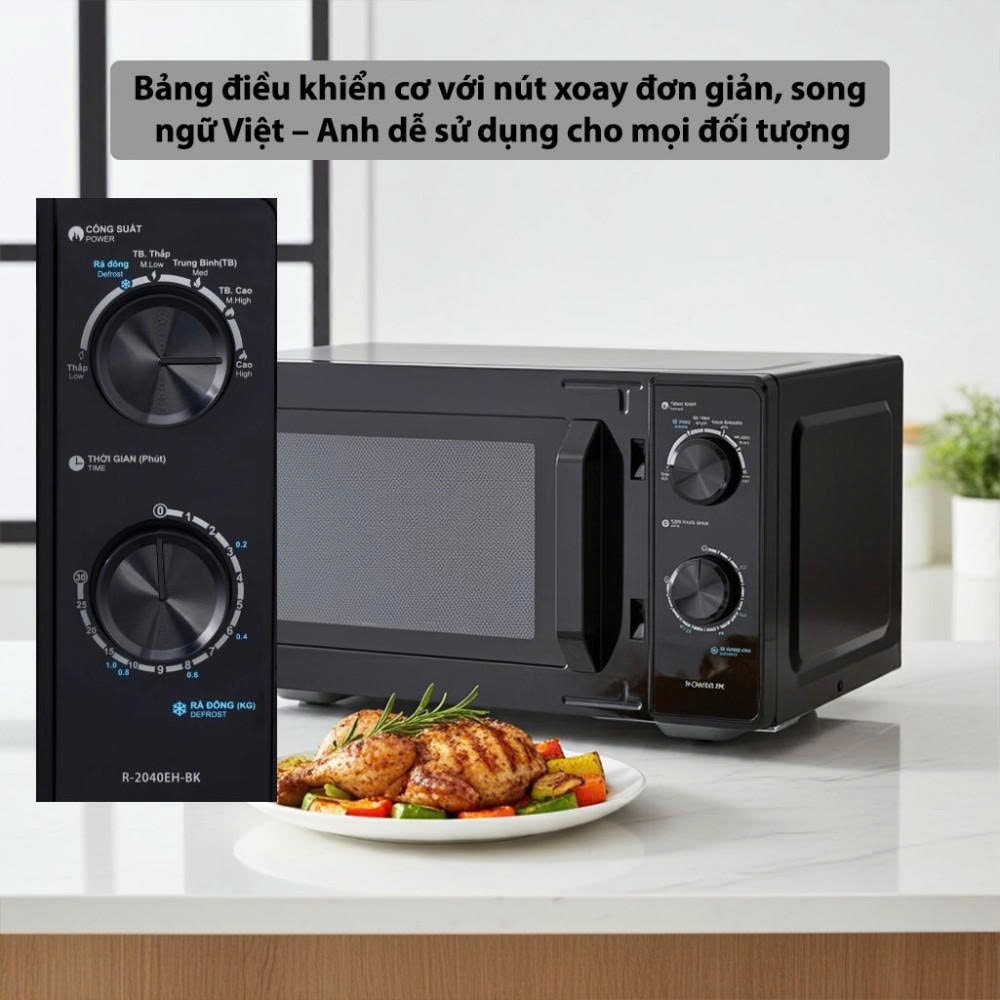 Với dung tích 20 lít, lò vi sóng Sharp R-2040EH-BK là sự lựa chọn lý tưởng cho các gia đình nhỏ hoặc người sống độc thân. Khoang lò rộng rãi giúp dễ dàng chứa các hộp đựng thực phẩm phổ biến.