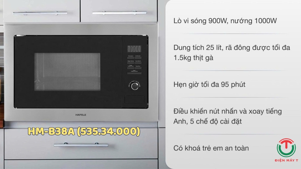 Lò vi sóng kết hợp nướng Hafele HM-B38A có tích hợp điều khiển bằng núm vặn, nút nhấn kèm theo màn hình LED. Bên trong khoang lò được thiết kế bằng thép không gỉ, an toàn khi nấu chống oxi hoá và dễ dàng vệ sinh. Tích hợp đèn chiếu sáng, giúp bạn có cái nhìn trực quan rõ ràng hơn thực phẩm trong lò.