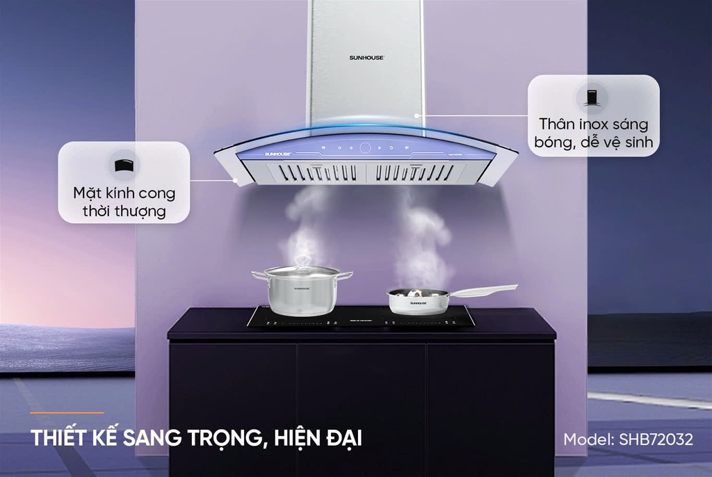 Máy hút mùi Sunhouse SHB72032 dạng kính cong sở hữu kiểu dáng hiện đại với thân máy inox sáng bóng sang trọng. Chất liệu này không bám bẩn, không bị oxy hóa (gỉ sét) và dễ dàng vệ sinh, luôn sáng bóng như mới, tăng thẩm mỹ cho ngôi nhà.