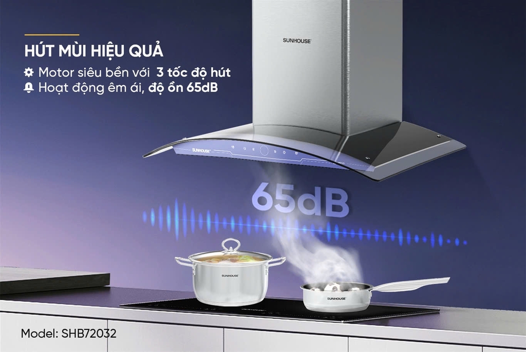 Độ ồn của máy hút mùi tối đa 65dB, hạn chế tiếng ồn xuống mức thấp nhất giúp máy hoạt động êm ái không làm ảnh hưởng đến môi trường xung quanh.