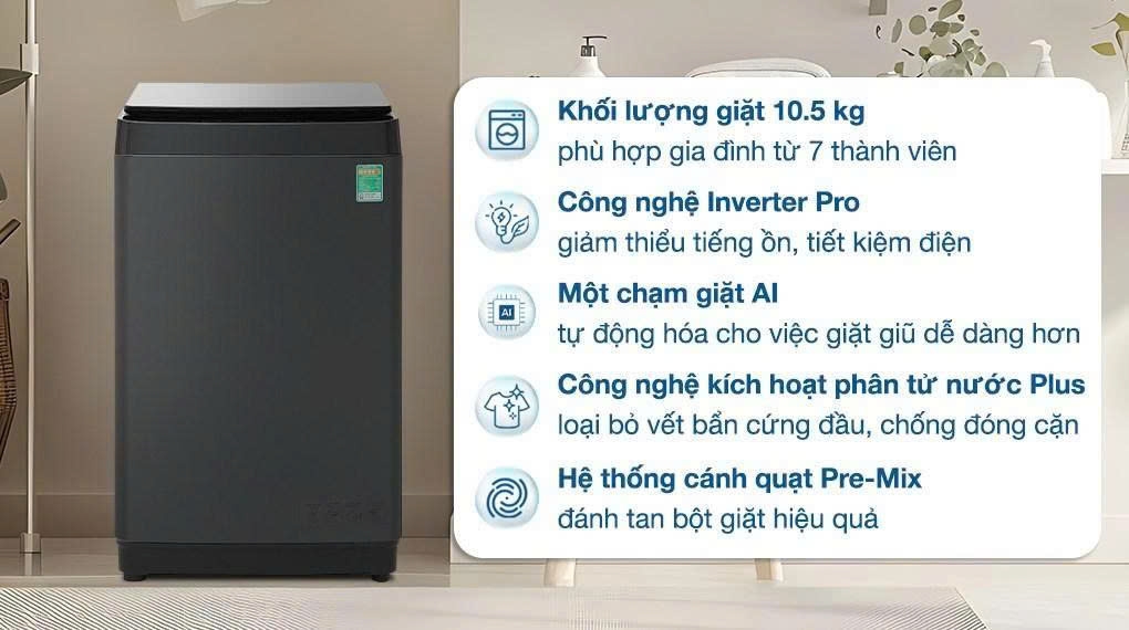 Máy giặt Hisense Inverter 10.5kg WT105F50 là sản phẩm máy giặt cửa trước tiên tiến, được thiết kế để đáp ứng nhu cầu giặt giũ của gia đình từ 7 thành viên trở lên. Với khối lượng giặt 10.5kg, máy dễ dàng xử lý các loại quần áo từ hàng ngày đến chăn màn lớn. Sản phẩm tích hợp các công nghệ hiện đại như Kích Hoạt Phân Tử Nước Plus, Động Cơ Truyền Động Trực Tiếp DD, và Giặt AI, mang lại hiệu quả giặt sạch vượt trội, tiết kiệm điện, nước và bảo vệ sợi vải.