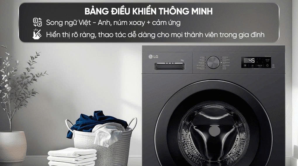Bảng điều khiển cảm ứng hiện đại, sử dụng ngôn ngữ Anh - Việt giúp mọi thành viên trong gia đình đều có thể thao tác dễ dàng. Màn hình hiển thị thời gian sắc nét giúp bạn kiểm soát tiến độ giặt giũ một cách chính xác.