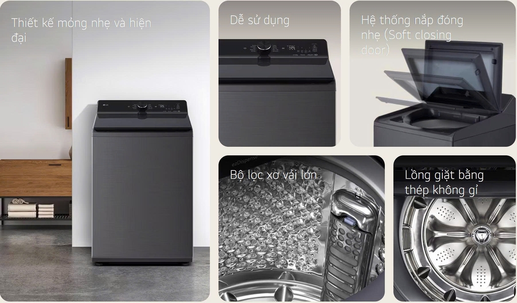 Máy Giặt LG Inverter 15 Kg T2315DX5G là giải pháp giặt giũ hoàn hảo cho gia đình đông người hoặc những ai cần xử lý lượng quần áo khổng lồ. Với khối lượng giặt "siêu khủng" 15kg, chiếc máy giặt lồng đứng này không chỉ nổi bật bởi khả năng tải lớn mà còn tích hợp hàng loạt công nghệ tiên tiến như TurboWash giặt nhanh và động cơ truyền động trực tiếp, Inverter bền bỉ, siêu tiết kiệm điện. Thiết kế sang trọng cùng khả năng điều khiển thông minh qua LG ThinQ chắc chắn sẽ nâng tầm trải nghiệm giặt giũ của bạn lên một đẳng cấp mới.