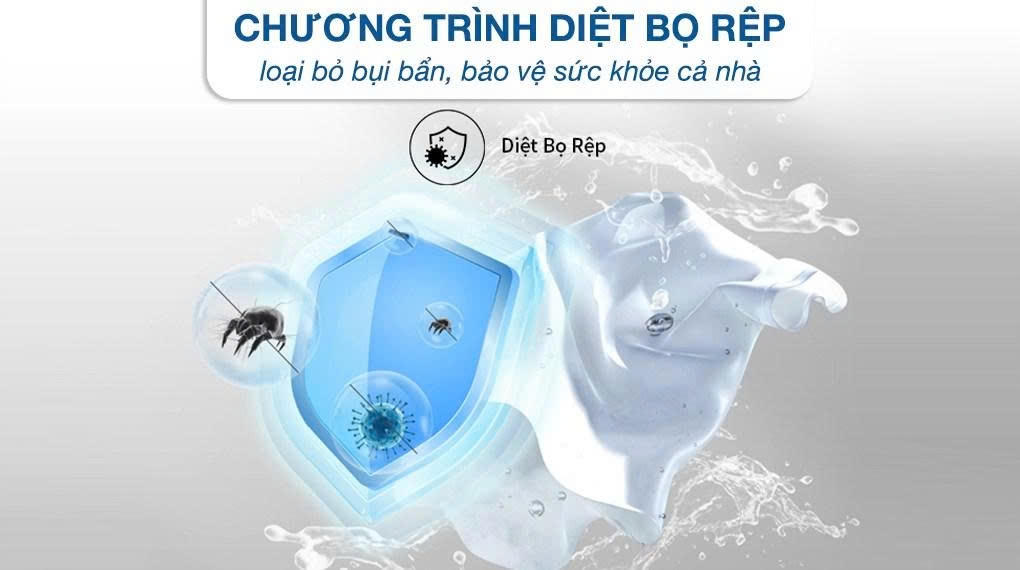 Một trong những điểm nổi bật của máy giặt Hisense WT90F30 là tính năng Diệt Bọ Rệp chuyên biệt. Dòng nước ma sát nhẹ nhàng sẽ tách bọ rệp ra khỏi sợi vải, sau đó được cuốn trôi và tiêu diệt hoàn toàn qua các chu trình xả và chà kỹ lưỡng. Đây là lựa chọn lý tưởng cho các gia đình có trẻ nhỏ, người cao tuổi hoặc người có làn da nhạy cảm, giúp bảo vệ sức khỏe tối đa.