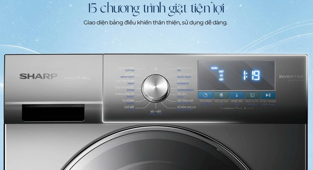 Máy giặt Sharp Inverter 11 Kg ES-FM110CB-DG với khối lượng giặt 11 kg, phù hợp cho gia đình có từ 7 thành viên trở lên. Máy tích hợp công nghệ giặt hơi nước Steam, giúp diệt khuẩn hiệu quả bằng hơi nước nóng, công nghệ Inverter tiên tiến tiết kiệm đáng kể điện trong quá trình sử dụng. Bảng điều khiển song ngữ Anh - Việt, tích hợp màn hình hiển thị rõ ràng, giúp mọi thành viên trong gia đình dễ dàng thao tác và sử dụng.