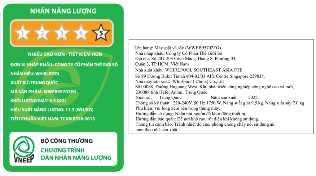 - Đạt 5 sao nhãn năng lượng với hiệu suất sử dụng điện khoảng 11.3 Wh/kg.