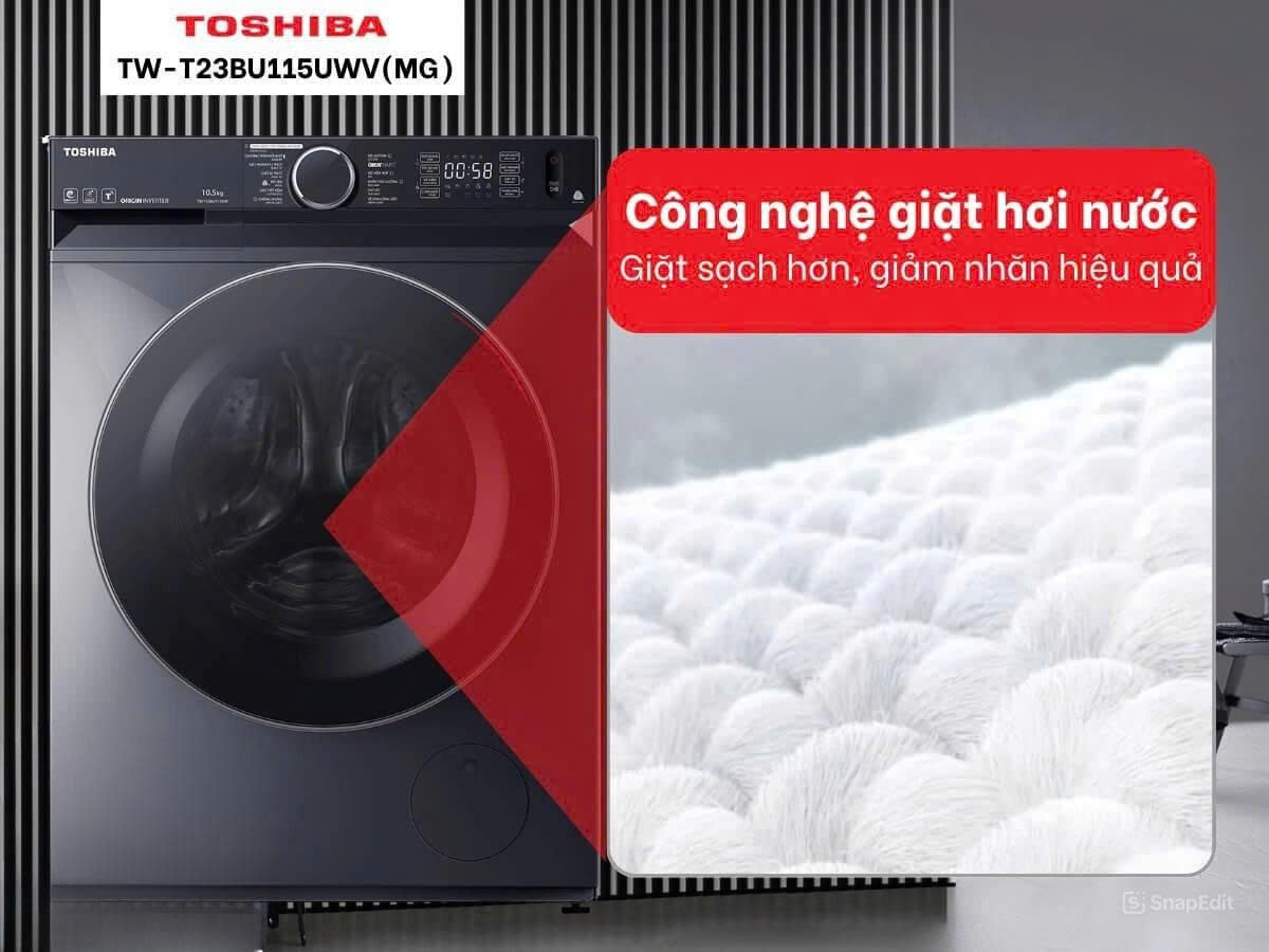 Máy giặt Toshiba TW-T23BU115UWV(MG) tích hợp công nghệ giặt hơi nước GreatSteam tiên tiến, sử dụng hơi nước nóng ở nhiệt độ cao giúp quần áo được giặt sạch hơn, làm mềm vải và giảm nhăn hiệu quả. Đặc biệt hơi nước nóng còn giúp diệt khuẩn và khử mùi tốt, mang lại quần áo sạch thơm, an toàn cho làn da nhạy cảm.