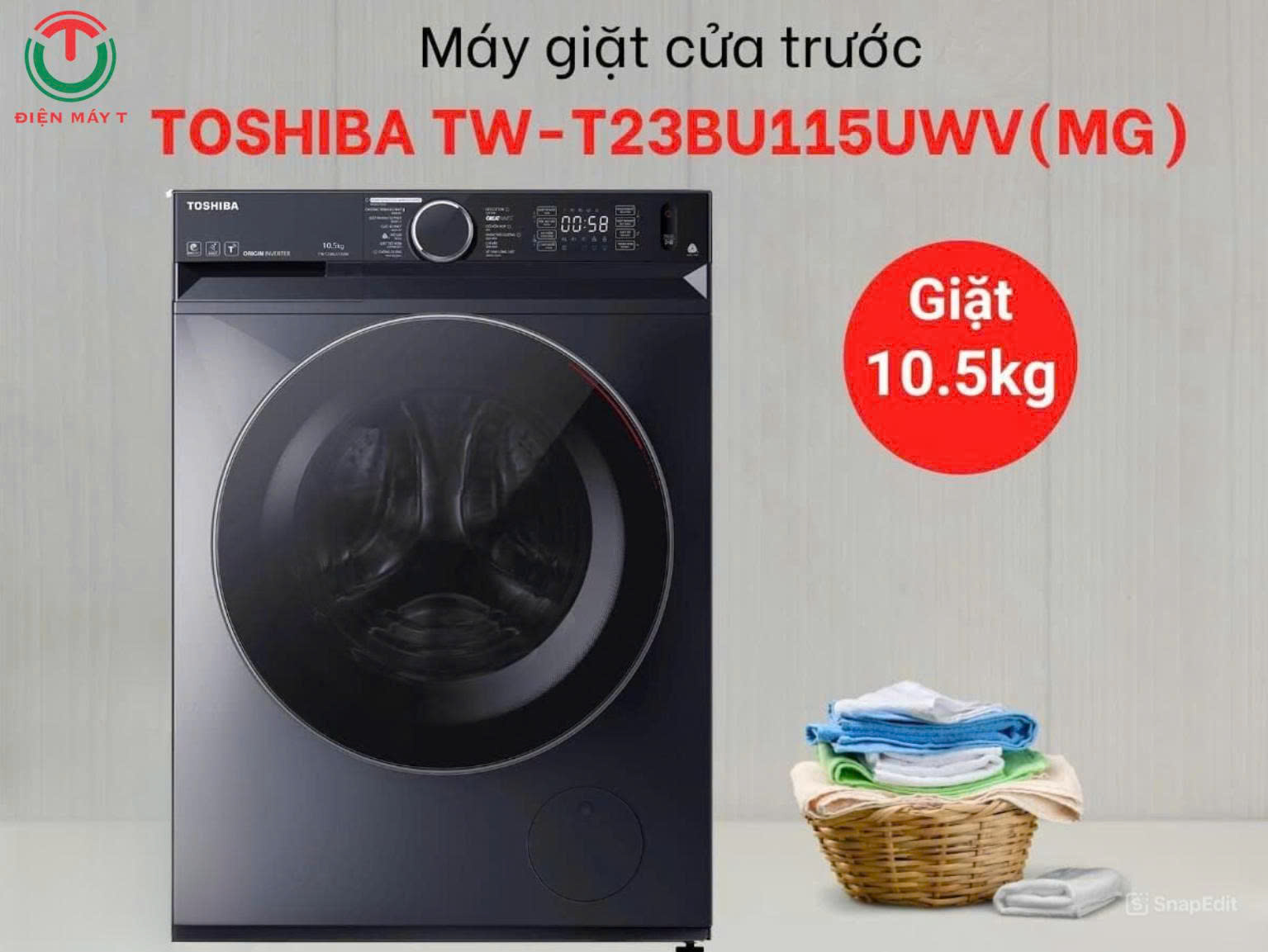 Máy giặt Toshiba TW-T23BU115UWV(MG) thiết kế cửa trước – lồng ngang với khối lượng giặt 10.5kg phù hợp với gia đình đông người. Máy được trang bị nhiều công nghệ tiên tiến như: giặt hơi nước GreatSteam giúp giặt sạch sâu và diệt khuẩn, giặt lưu hương Aroma+, công nghệ Siêu bọt khí nano UFB, công nghệ GreatWaves bảo vệ vải, giảm phai màu, công nghệ Inverter tiết kiệm điện… 12 chương trình giặt đa dạng, đáp ứng đầy đủ nhu cầu giặt giũ của gia đình. Hệ thống điều khiển núm vặn kết hợp cảm ứng và màn hình hiển thị LED hiện đại, giao diện tiếng Anh – Việt dễ dàng sử dụng.