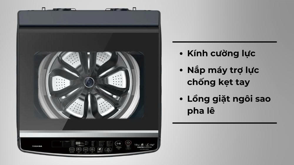 Mẫu máy giặt Toshiba cửa trên này sở hữu khối lượng giặt lớn, lên đến 15kg. Vậy nên đây sẽ là lựa chọn phù hợp dành cho những gia đình đông người, có trên 7 thành viên. Ngoài ra, những gia đình có ít người hơn nhưng cần làm sạch nhiều đồ hằng ngày vẫn có thể chọn sử dụng chiếc máy giặt Toshiba 15kg này.