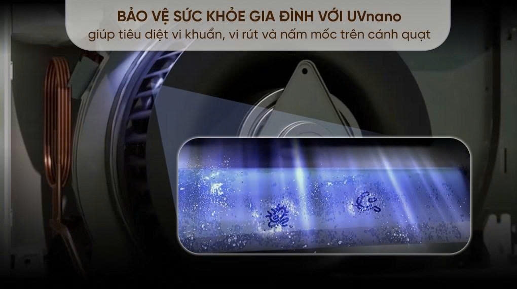 Bên cạnh đó, máy còn tích hợp công nghệ UVnano để tiệt trùng cánh quạt bên trong máy, ngăn chặn vi khuẩn tích tụ, đảm bảo luồng khí thoát ra luôn sạch sẽ và đảm bảo an toàn cho sức khỏe.