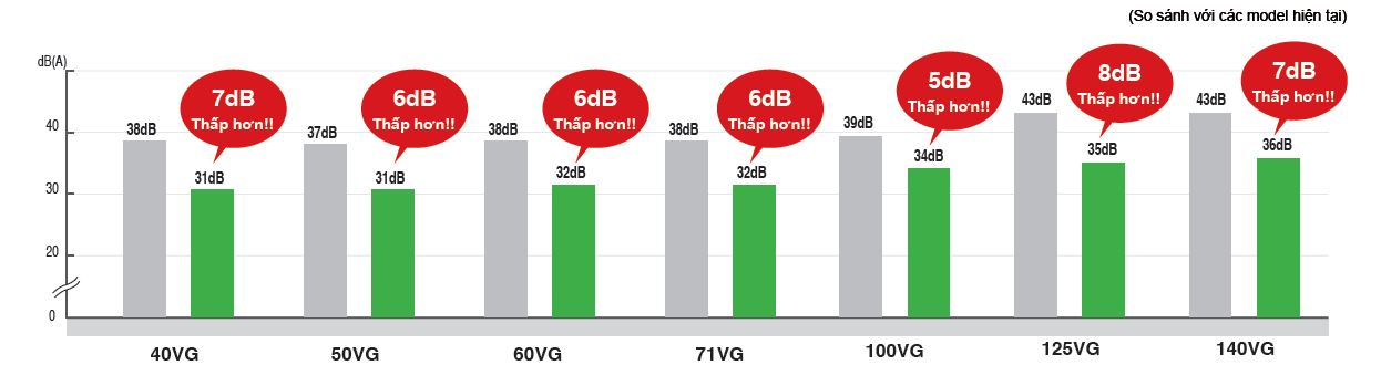 Độ ồn thấp do giảm lưu lượng gió, giảm áp lực thất thoát bằng cách tối ưu hình dạng khoang chứa và miệng phân phối gió