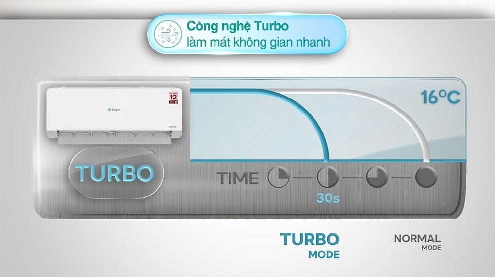 Kích hoạt chế độ Turbo, điều hòa sẽ hoạt động ở cấp độ thổi gió cao nhất mang đến hiệu quả làm mát rất nhanh chỉ trong 30 giây giúp bạn tận hưởng ngay bầu không khí dễ chịu mát mẻ.