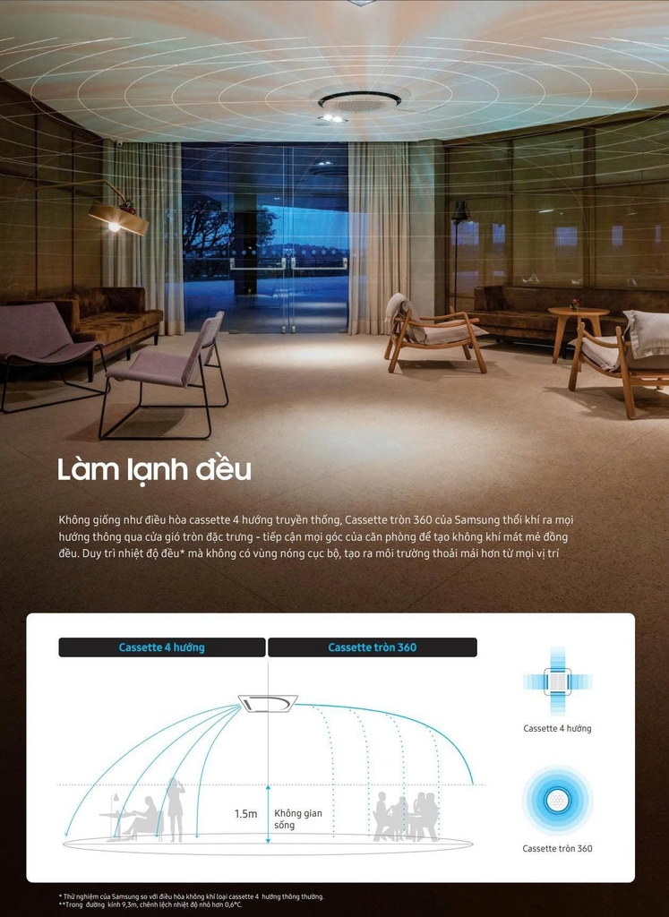 Với thiết kế tròn đều độc đáo, Cassette tròn 360 của Samsung không chỉ mang lại vẻ thẩm mỹ khác biệt cho không gian sống mà còn làm lạnh đều từ mọi hướng, giúp tạo môi trường lý tưởng có nền nhiệt độ đồng đều trong phòng*. Cấu tạo không có cánh đảo gió đảm bảo 100% lượng gió được phân phối trực tiếp vào phòng giúp làm lạnh nhanh và thổi xa hơn.