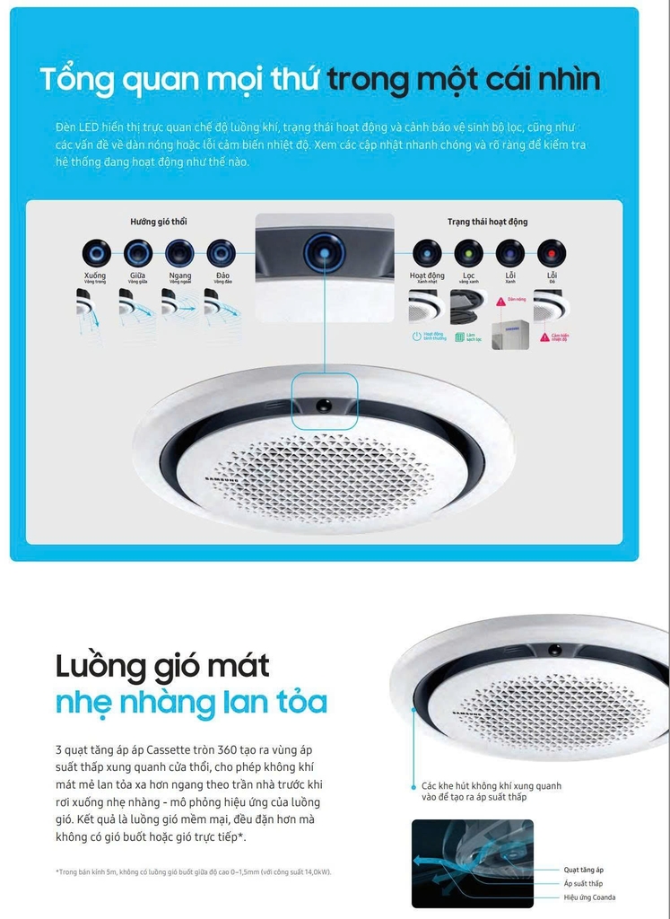 3 quạt tăng áp Cassette tròn 360 tạo ra vùng áp suất thấp xung quanh cửa thổi, cho phép không khí mát mẻ lan tỏa xa hơn ngang theo trần nhà trước khi rơi xuống nhẹ nhàng - mô phỏng hiệu ứng của luồng gió. Kết quả là luồng gió mềm mại, đều đặn hơn mà không có gió buốt hoặc gió trực tiếp.