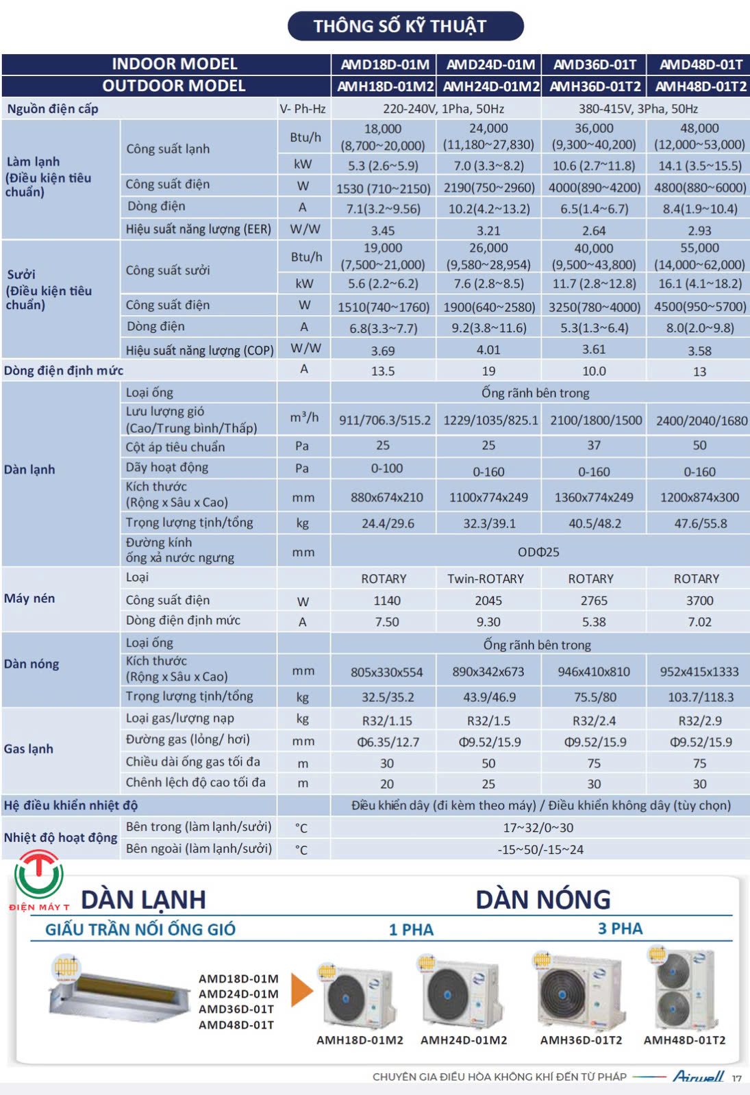 Máy lạnh giấu trần nối ống gió Airwell Inverter AMD48D-01T/AMH48D-01T2 ( 3pha )