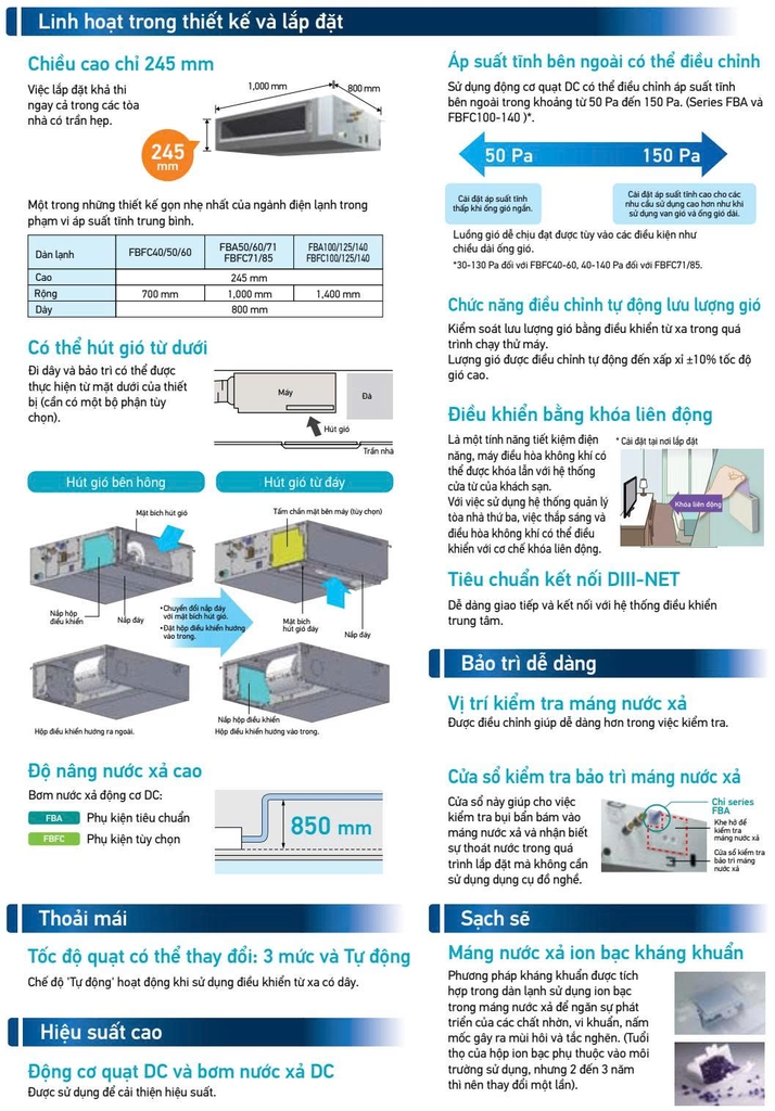 Áp suất tĩnh có thể được điều chỉnh tự do từ 50-150 Pa để gửi không khí gần và xa dọc theo chiều dài của ống dẫn khí. Đáp ứng các thiết kế nội thất khác nhau và cung cấp sự mát mẻ triệt để.