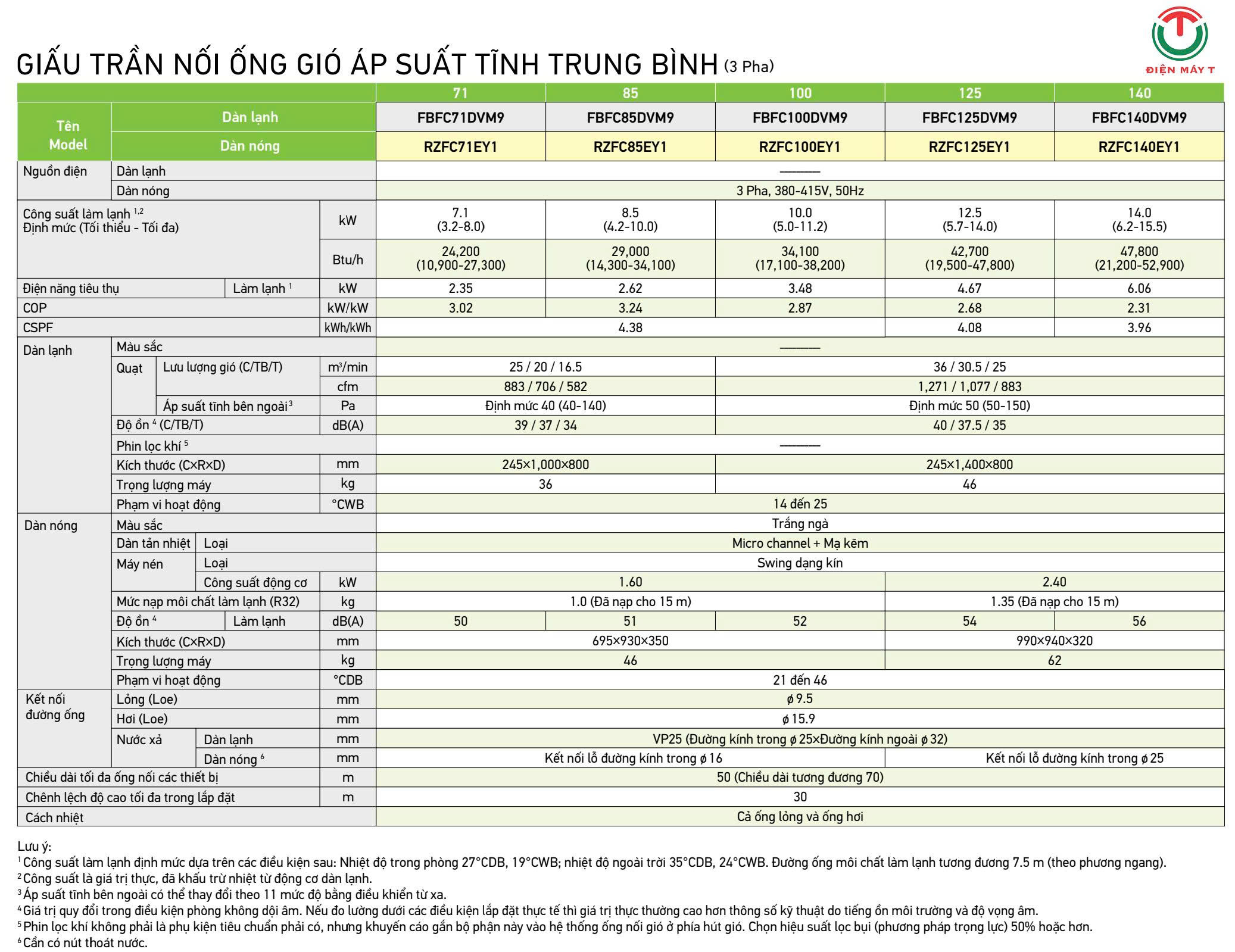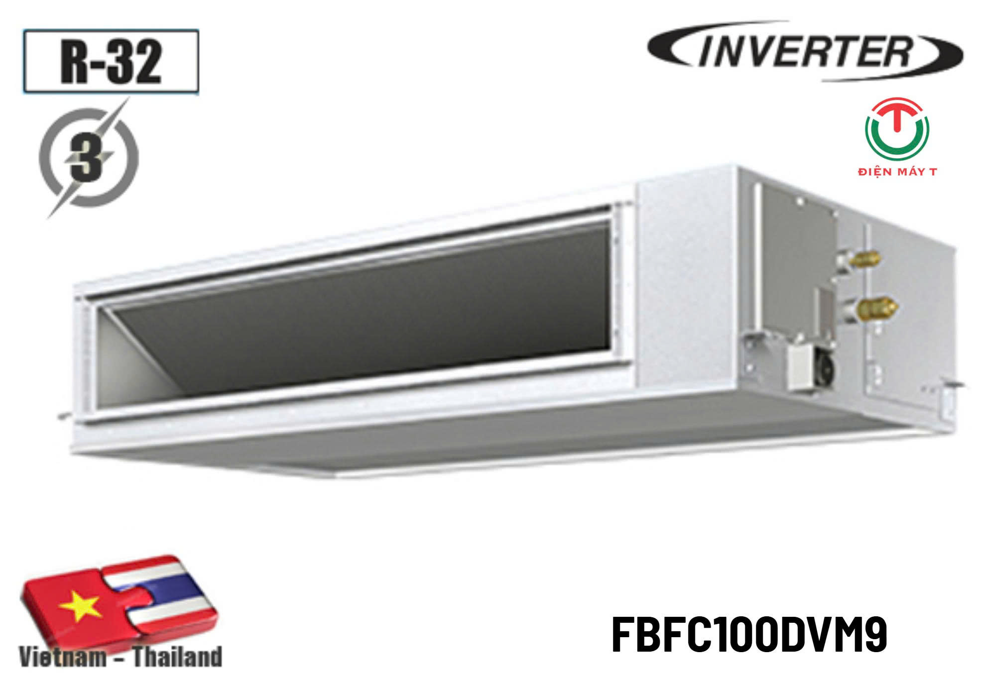 Điều hòa âm trần nối ống gió Daikin FBFC100DVM9/RZFC100EY1 chính hãng: Dàn lạnh FBFC100DVM9 sản xuất tại Việt Nam, Dàn nóng RZFC100EY1 nhập khẩu chính hãng tại Thái Lan.
