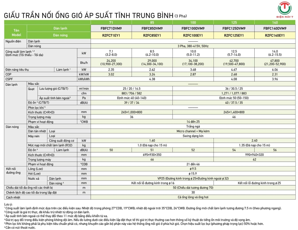 Máy điều hòa Daikin âm trần nối ống gió FBFC140DVM9/RZFC140EY1 sử dụng nguồn điện 3 pha (V/Ø/Hz: 380-415,3,50-60)