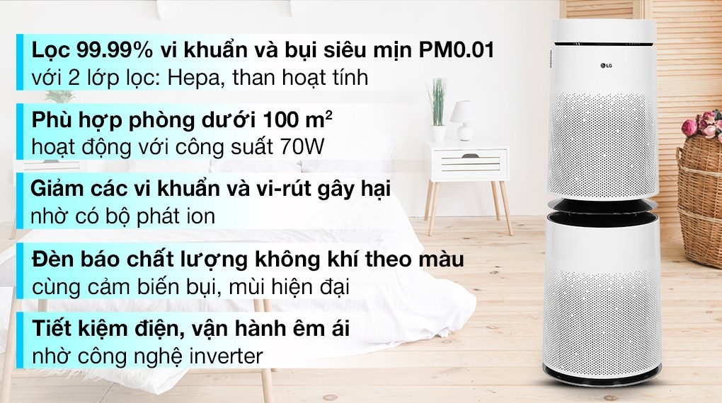 Ngoài ra, công suất 70W của chiếc máy lọc không khí LG này đáp ứng hiệu quả lọc khí tối ưu cho những căn phòng có diện tích trên 40m² như phòng khách, phòng ngủ, phòng làm việc,…