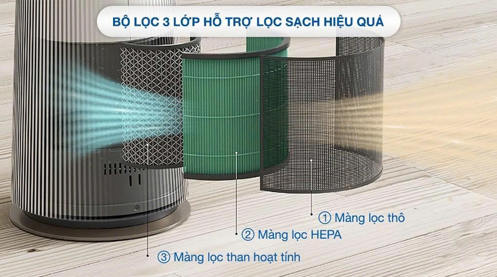 Hệ thống lọc 3 bước này giúp loại bỏ các chất có hại như các hạt lớn, bụi mịn, virus và vi khuẩn. Giúp không gian sống của bạn trở nên trong lành hơn và an toàn cho sức khỏe.