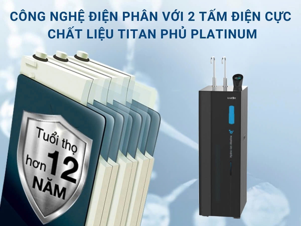 Công nghệ điện phân Hydro-ion với tấm điện cực Titan phủ bạch kim siêu quý hiếm (bảo hành tấm điện cực lên đến 5 năm - thời gian sử dụng lên đến 10 năm, bảo dưỡng định kỳ miễn phí hàng năm trong thời gian bảo hành dành cho Khách hàng đăng ký), kết hợp với màng ngăn hiện đại giúp tăng gấp đôi hiệu suất điện phân, tăng gấp 3 hàm lượng Hydro-ion kiềm có trong nước. Đặc biệt, duy nhất tại Karofi, công nghệ Hydro-ion được thiết kế dạng lõi trong suốt, giúp người dùng có thể tận mắt quan sát trực tiếp quá trình điện phân tạo Hydro-ion kiềm thật.
