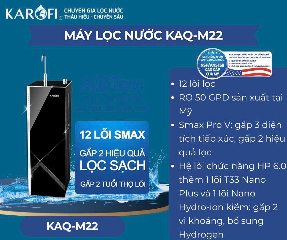 KAQ-M22 được trang bị công nghệ AioTec thông minh giúp người dùng có thể an tâm kiểm soát toàn diện chất lượng nước sau lọc, cảnh báo thay lõi, kích hoạt bảo hành... dù ở bất cứ nơi đâu.