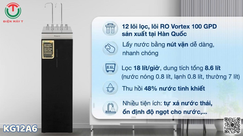 Máy lọc nước Hydrogen Kangaroo KG12A6 thế hệ mới 2024 được trang bị hệ lõi siêu lọc 12 lõi vượt trội, gấp đôi Hydrogen và khoáng chất cho cơ thể. Màng lọc RO Vortex giúp giảm 75% nước thải, tuổi thọ kéo dài tới 3 năm.