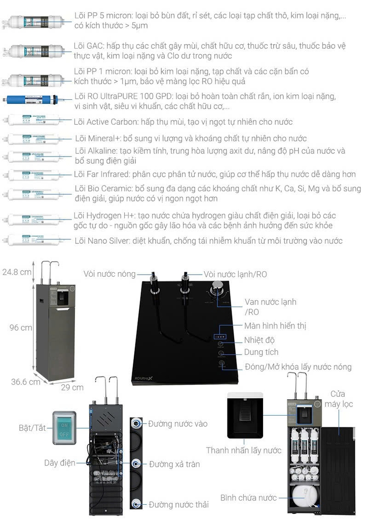 Máy lọc nước RO UltraX SUNHOUSE 11 lõi SHA76688SH gồm 11 lõi với các công dụng khác nhau, được chia làm 3 cấp lọc: cấp lọc thô, cấp lọc tinh và cấp lọc bù khoáng. Cụ thể trong đó: