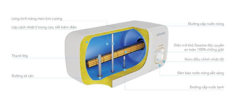 Máy tắm nước nóng Atlantic được trang bị cầu dao chống rò điện PRCD chống giật, có chức năng tự động ngắt kết nối giữa thiết bị với mạch điện, hạn chế sự cố chập điện bên trong máy, đảm bảo an toàn cho người sử dụng cũng như phòng chống cháy nổ, tránh xảy ra những tai nạn đáng tiếc. Máy được ứng dụng công nghệ Steatite chống bám bẩn và chịu được nước xấu, công nghệ kháng khuẩn ion bạc an toàn sức khỏe.