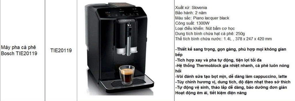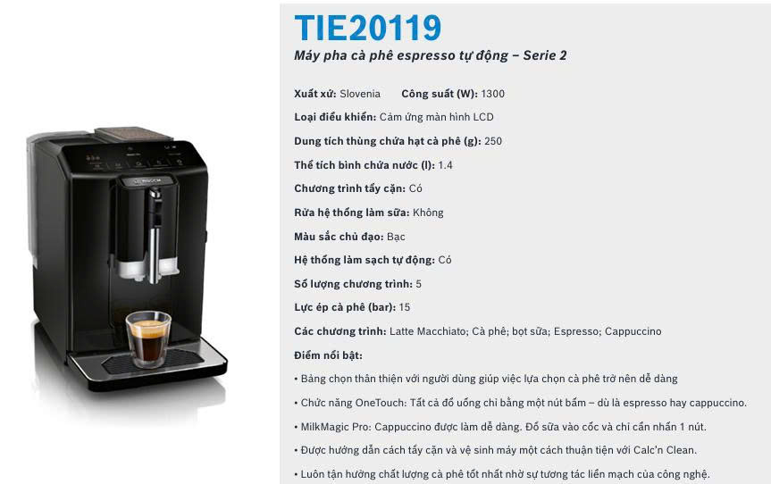 Cà phê từ lâu đã trở thành một phần không thể thiếu trong cuộc sống hiện đại. Một tách espresso đậm đà vào buổi sáng, ly cappuccino béo ngậy buổi chiều hay latte nhẹ nhàng khi thư giãn – tất cả đều có thể mang lại nguồn cảm hứng bất tận cho ngày mới. Thay vì phải ra quán cà phê mỗi ngày, nhiều người tiêu dùng hiện nay lựa chọn máy pha cà phê để thưởng thức hương vị cà phê chuẩn quán ngay tại nhà. Trong số những thương hiệu nổi tiếng toàn cầu, Bosch – tập đoàn công nghệ hàng đầu đến từ Đức – luôn được đánh giá cao nhờ sự bền bỉ, thiết kế tinh tế và khả năng hoạt động ổn định. Một trong những sản phẩm nổi bật trong phân khúc máy pha cà phê gia đình đó là Máy pha cà phê Bosch TIE20119. Với thiết kế hiện đại, công nghệ chiết xuất tiên tiến và thao tác cực kỳ đơn giản, sản phẩm này hứa hẹn mang đến trải nghiệm cà phê chuẩn quán barista ngay tại căn bếp của bạn.