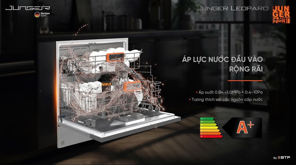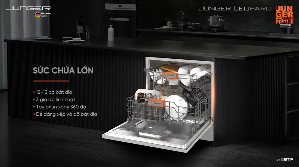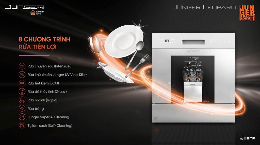 Máy rửa bát Junger Leopard DWJ-100 được ứng dụng 4 công nghệ hiện đại bậc nhất mang lại hiệu quả rửa bát “Sạch khô tuyệt đối"