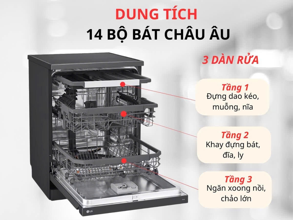 – Máy rửa chén LG này được thiết kế bên trong gồm có 3 khay rửa: khay dao muỗng, khay trên và khay dưới.