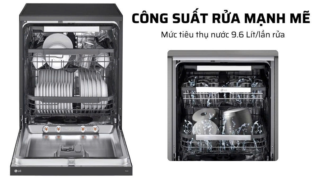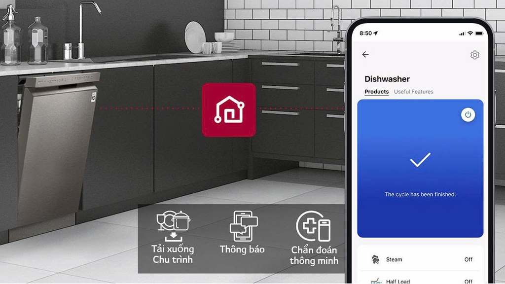 – Điều khiển bằng điện thoại thông ứng dụng LG ThinQ: điều khiển các chức năng của máy rửa bằng điện thoại từ xa giúp người dùng dễ dàng kiểm soát thời gian hoạt động của máy.