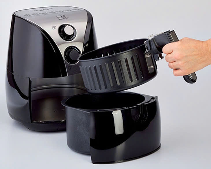 Nồi sử dụng chất liệu nhựa sáng bóng, bền bỉ có khả năng chịu lực. Khay chiên, giỏ chiên có tay cầm, tháo rời để lấy thực phẩm ra và vệ sinh lòng bên trong một cách dễ dàng. Giỏ chiên có lỗ lọc dầu giúp thực phẩm không bị ngấm dầu mỡ giúp tim mạch khỏe mạnh hơn.