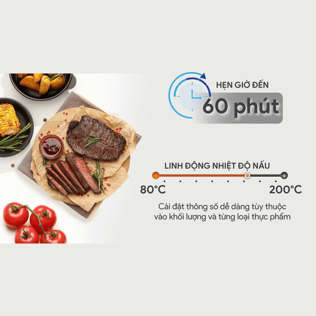 2. Hẹn giờ từ 0 – 60 phút cùng nhiệt độ từ 80 – 200 độ C thuận tiện điều chỉnh tùy từng món ăn, phù hợp nhiều nhu cầu khác nhau.