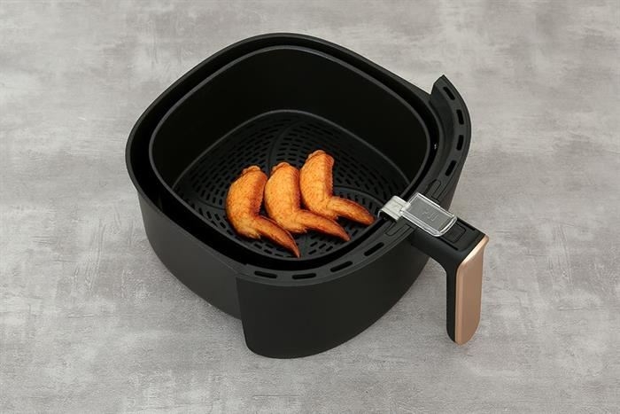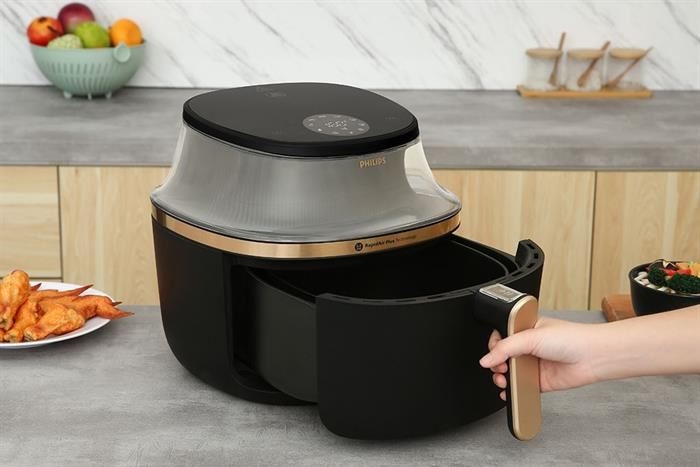 - Công nghệ Rapid Air Plus với mâm nhiệt hình sao và rổ chiên tách rời, tăng tuần hoàn nhiệt mạnh mẽ, giúp thực phẩm chín ngoài mềm trong, đều hai mặt không cần lật trở.