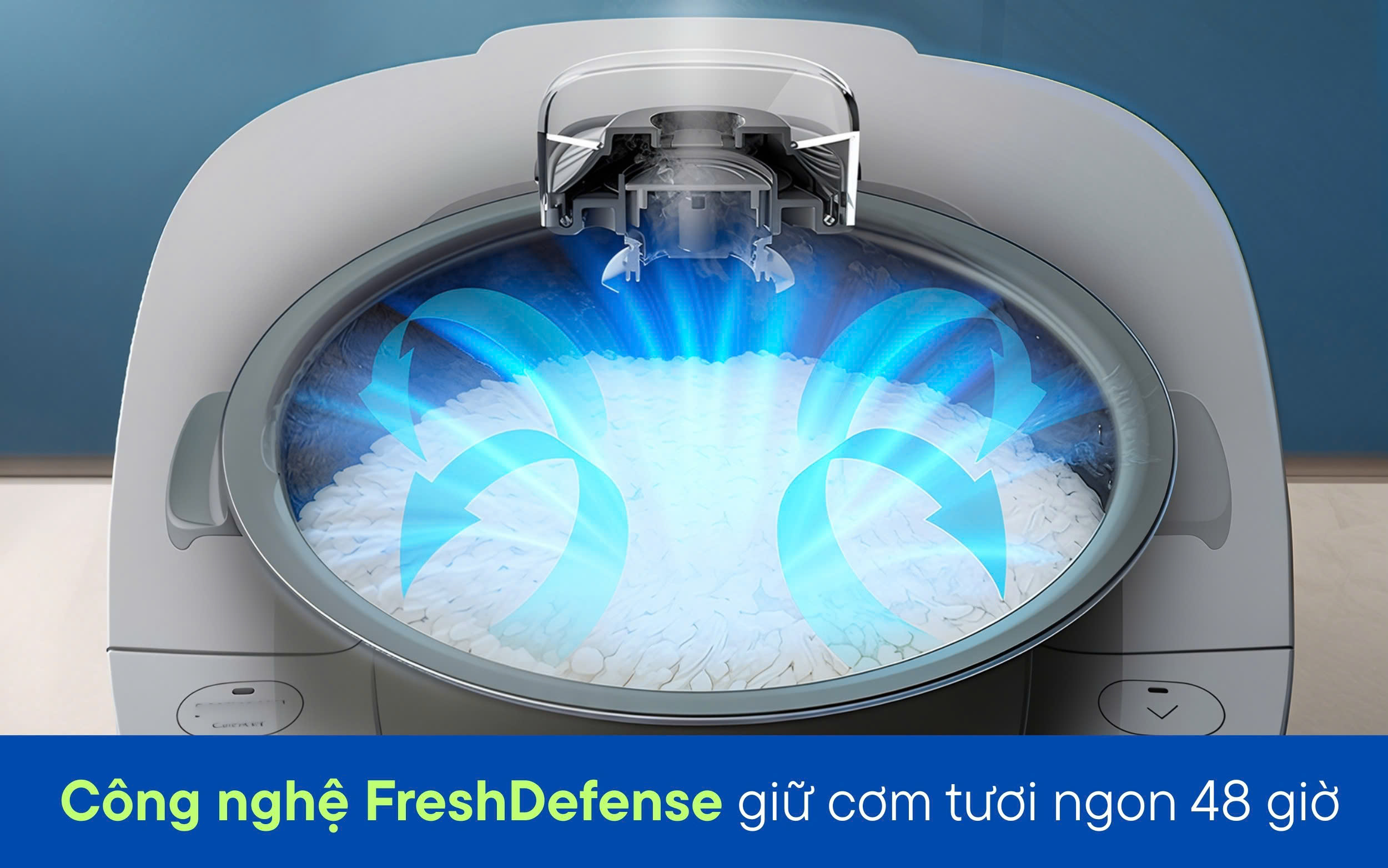 Một trong những tính năng nổi bật nhất của Nồi cơm điện tử Philips HD4719/32 là công nghệ FreshDefense độc quyền. Công nghệ này sử dụng van hơi nước hai kênh được thiết kế đặc biệt, giúp duy trì độ ẩm lý tưởng cho hạt cơm ở mức 63%. Nhờ đó, cơm luôn trắng, tơi xốp và giữ được hương vị thơm ngon như vừa nấu trong suốt 48 giờ. FreshDefense cũng kiểm soát nhiệt độ chính xác, tối ưu khả năng giữ nhiệt và liên tục luân chuyển không khí sạch, ngăn chặn hiệu quả sự phát triển của vi khuẩn. Bạn hoàn toàn có thể an tâm về chất lượng và độ an toàn của cơm trong mọi bữa ăn.