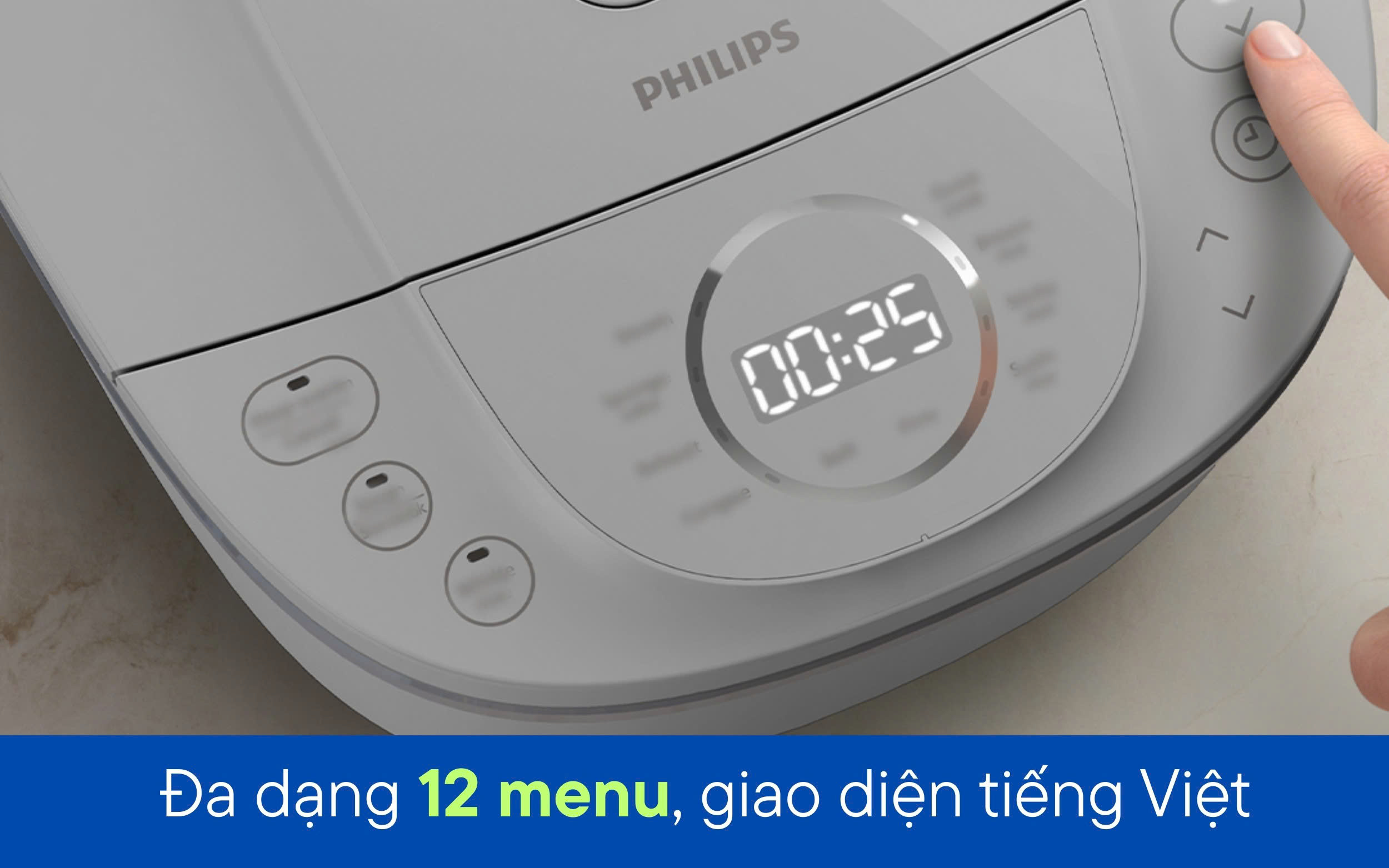 Với công suất 860W mạnh mẽ, Nồi cơm điện tử Philips HD4719/32 được trang bị hệ thống nhiệt 3D thông minh tiên tiến. Lòng nồi được làm nóng mạnh mẽ và đồng đều từ ba phía: trên xuống, dưới lên và từ hai bên. Sự kết hợp này cùng với chip nấu ăn thông minh giúp kiểm soát chính xác hơi nóng và nhiệt độ trong suốt quá trình nấu. Điều này không chỉ đảm bảo cơm chín đều, hạt cơm nở căng, thơm ngon mà còn giúp giải phóng hương thơm tự nhiên của gạo, mang lại trải nghiệm ẩm thực tuyệt vời.