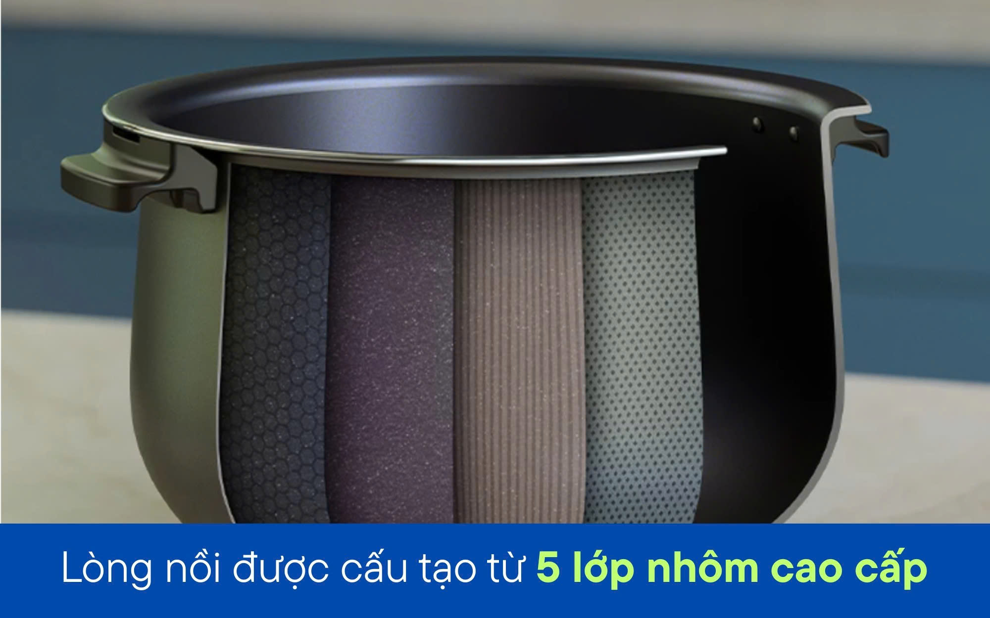 Phần lòng nồi của Nồi cơm Philips HD4719/32 là một kiệt tác kỹ thuật. Nó được thiết kế với hình cầu và đáy tròn 60⁰, không chỉ mang lại vẻ ngoài độc đáo mà còn tăng cường bề mặt gia nhiệt lên đến 50% so với lòng nồi thông thường. Điều này đảm bảo nhiệt lượng được phân bổ đều khắp các hạt gạo, giúp cơm chín đều từ trong ra ngoài. Lòng nồi được cấu tạo từ 5 lớp nhôm cao cấp, dày 2mm, tối ưu khả năng truyền và giữ nhiệt.